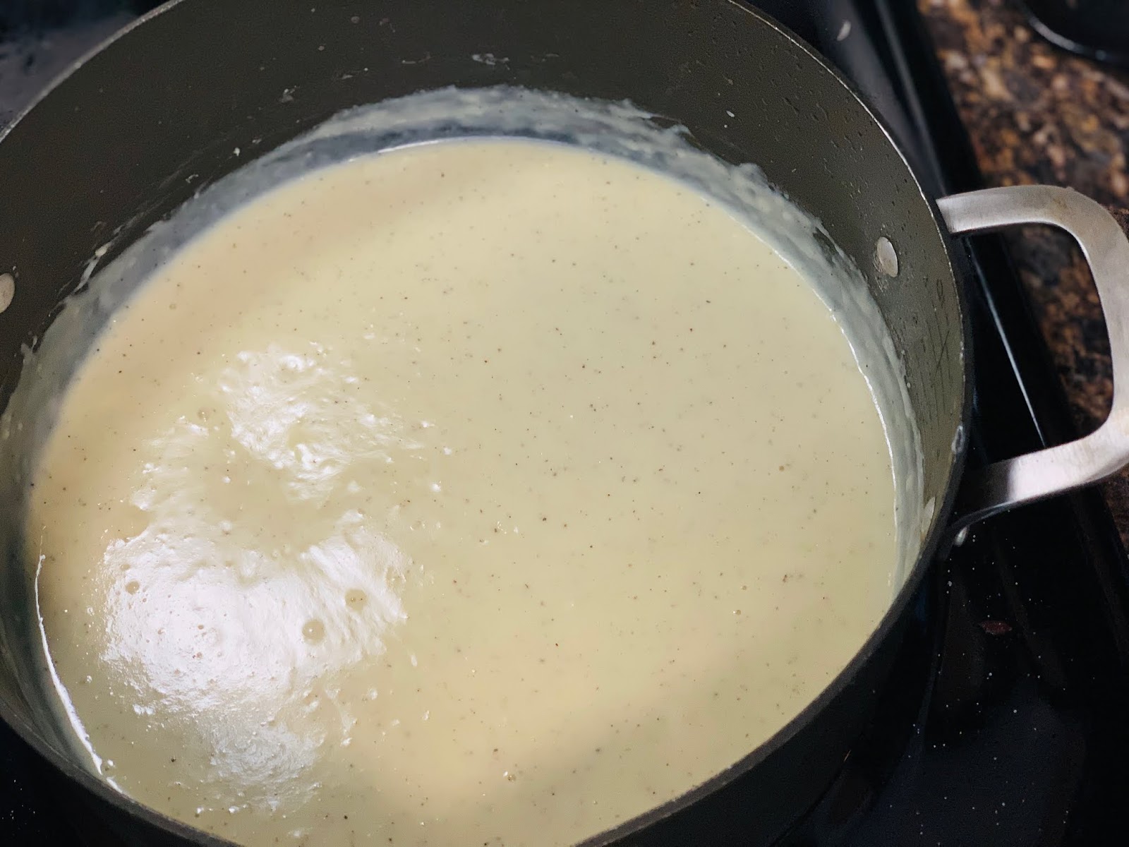 Once your flour and butter are well mixed, start pouring in your milk a little bit at a time, making sure to whisk continuously. When you have all of your milk mixed in, add in your salt and pepper in accordance to your taste preferences. Then add in a splash of chicken stock. Whisk again and start to add in your Fontinella cheese saving a few tablespoons to garnish at the end.